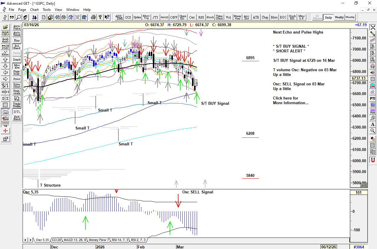 A large gap higher – well above the Cover Short Signal line at 6668 – is met with choppy stabilization, triggering an S/T Buy Signal at 6729 (just) before dropping back.