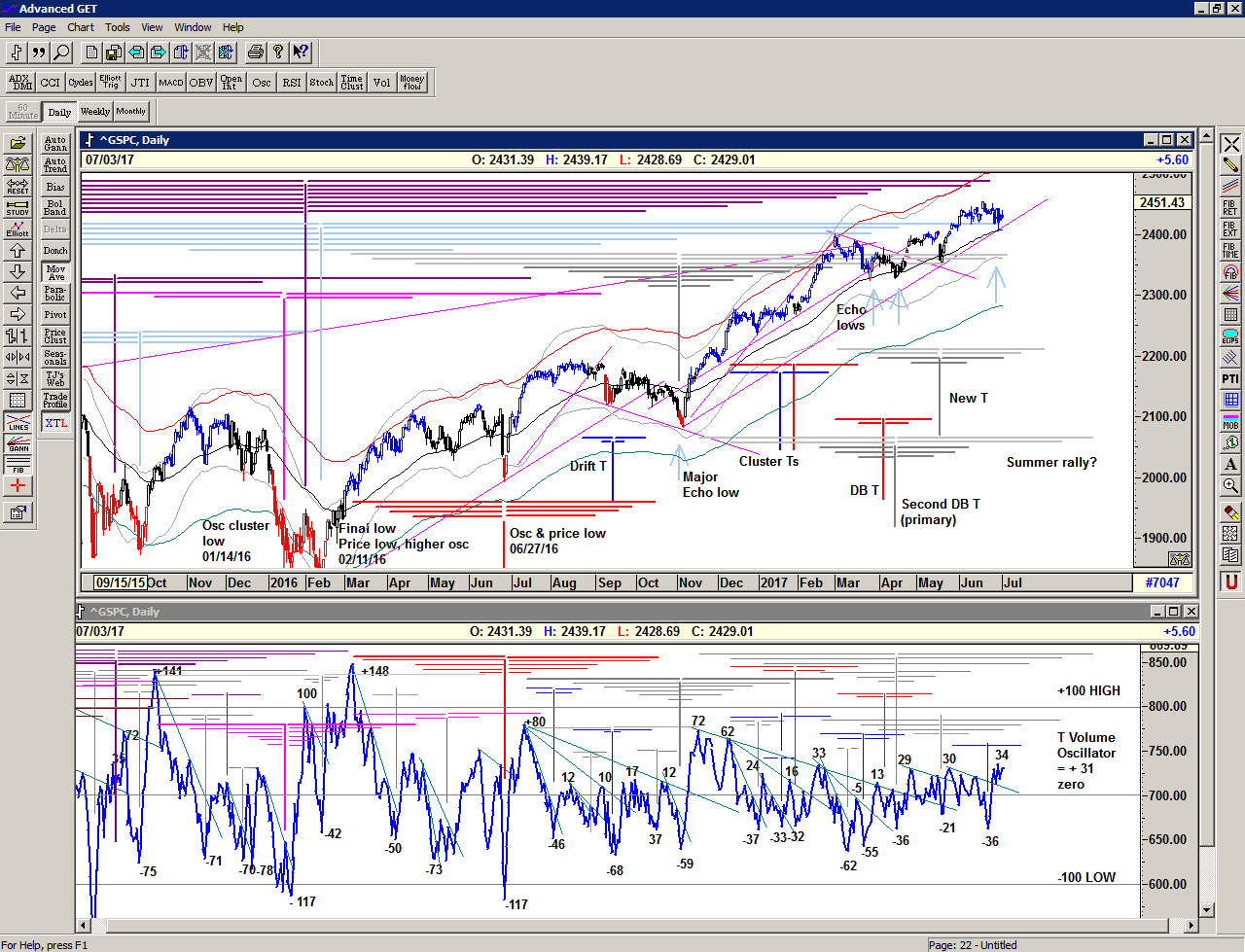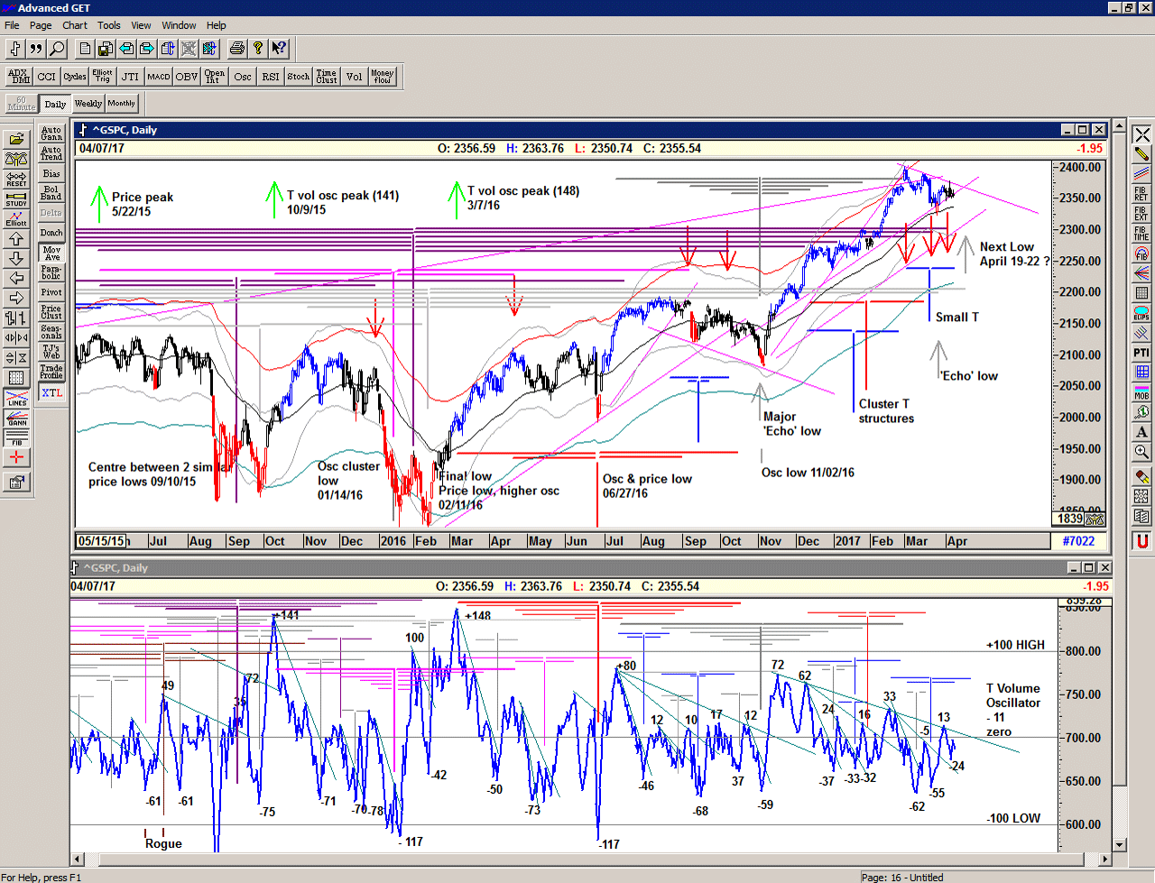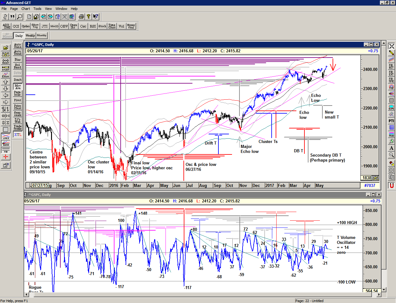 Although there are additional projections for upcoming highs, it would seem likely that we are now entering a sideways consolidation phase to absorb the current higher prices, and this is also backed up by the declining momentum of the OSc oscillator which is now close to Sell Signal. Although OSc sell signals may sometimes occur before price drops, they more accurately suggest that price will not move significantly higher, and that selling into strength or profit-taking may start occuring. However, the T volume oscillator remains relatively strong, for now.
