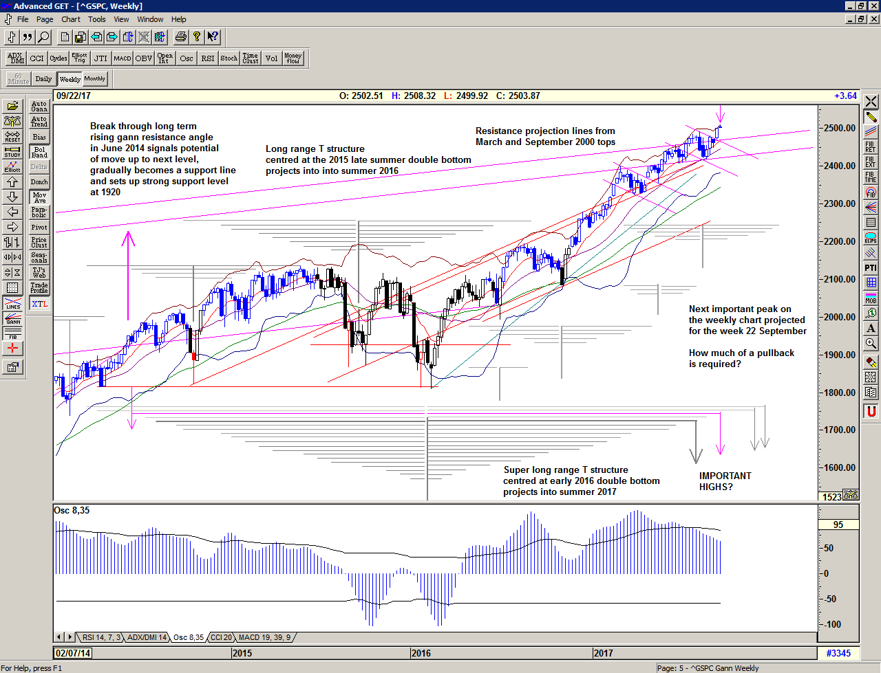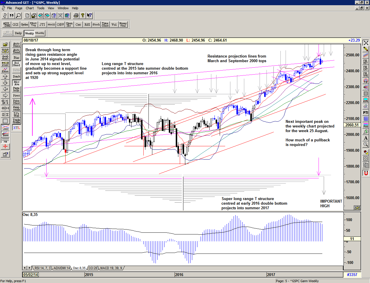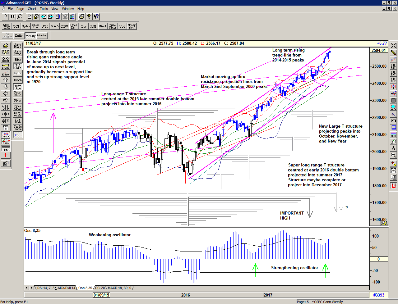 And so it appears that the market is exactly where it should be, and it has synchronised in time and price, establishing important new highs, close to projected peaks and close to an important trend line.