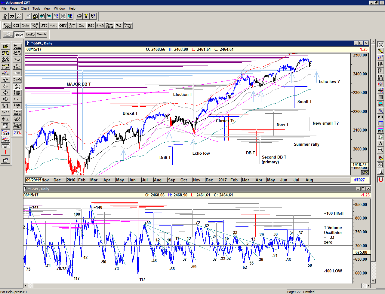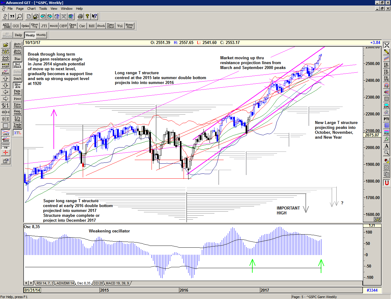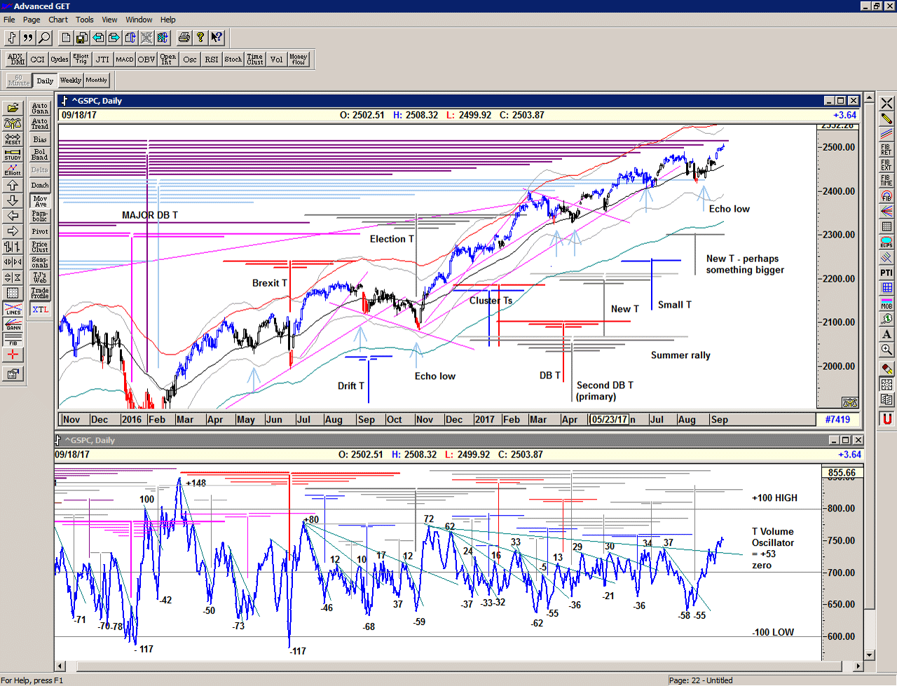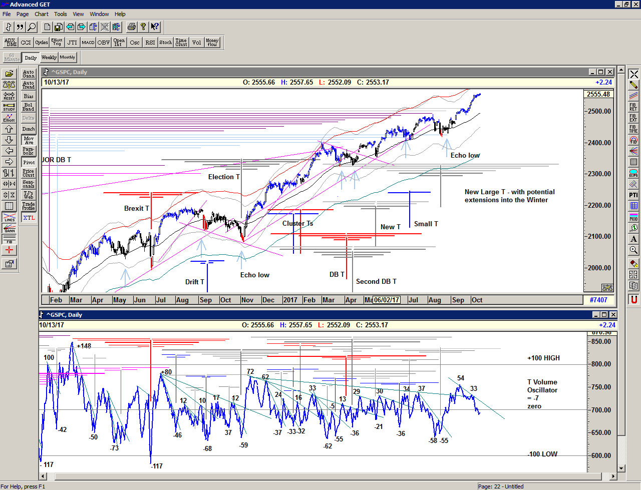 Looking at the bigger picture with the T volume oscillator underlaid, we can see what a good signal we received on 11 September when the oscillator rose above the long cash build up line, making a new relative high. The subsequent 'pullback' in the oscillator as the market continued higher was all the 'correction' that was needed to provide the fuel for the newer T structures. In effect the downward movement of the oscillator describes profit-taking and therefore the build up of cash on the sidelines waiting for re-investment.