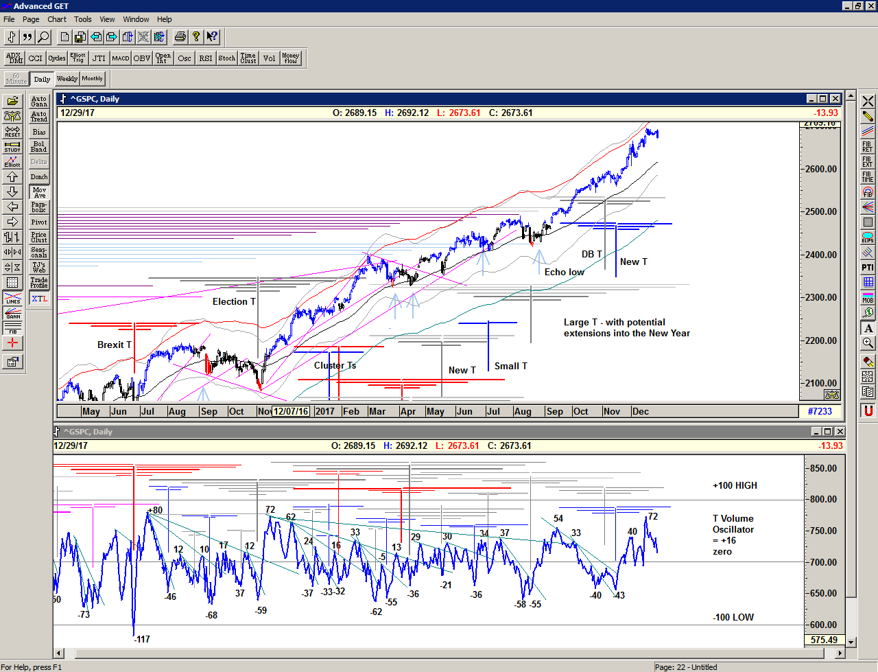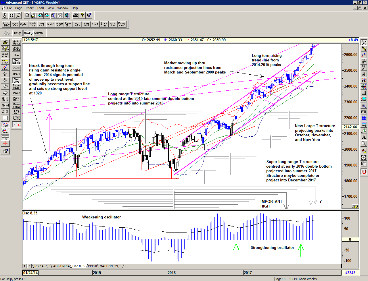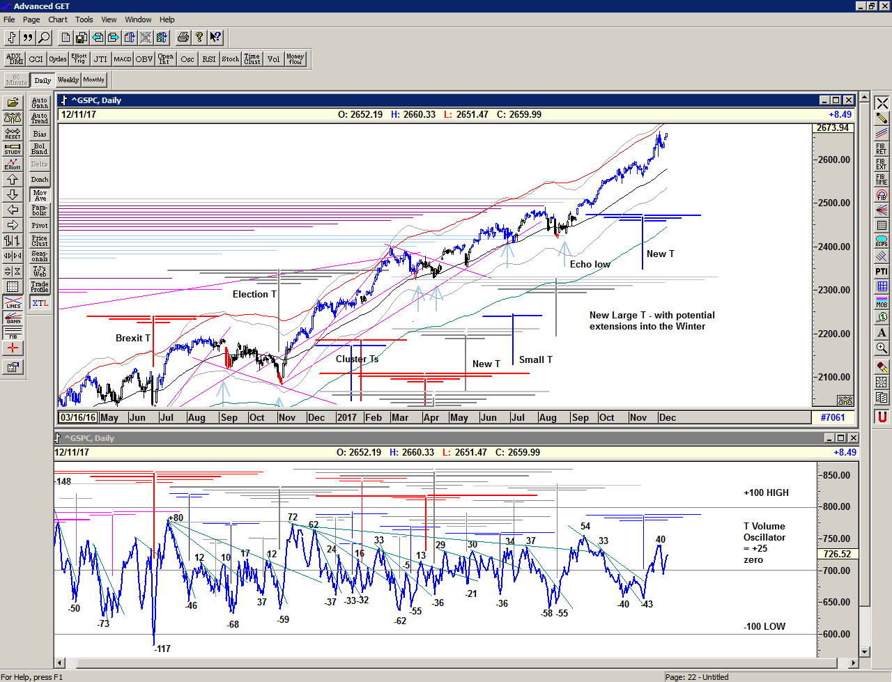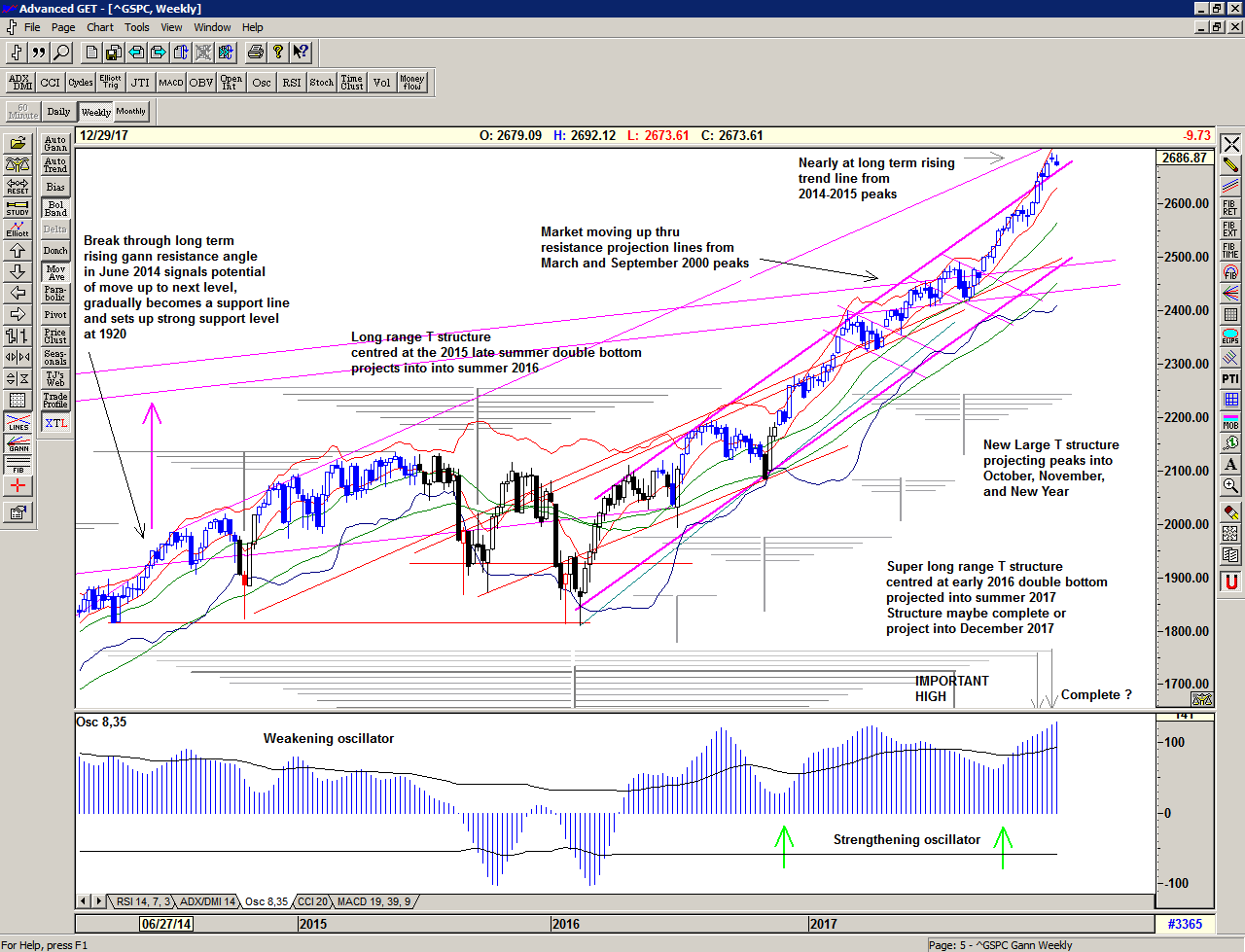 On the weekly chart we can see that the market has been rising towards the long term term rising trend line, and is nearly there. At the same time, we did have a possible completion of the Super long range T structure projected for early and late December – and that may well explain the additional volatility that came into the market in December.