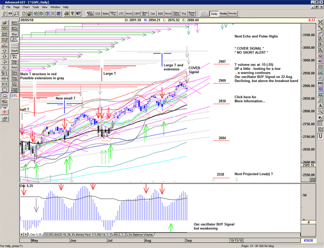A straight up day from a gap down, moving up through the S/T BUY signal line at 2888, and through the recent declining resistance.