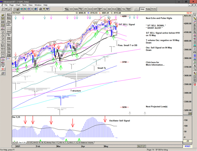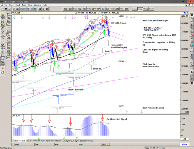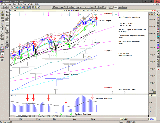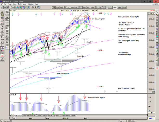Market gaps lower – below the S/T Sell Signal line at 4167 – making short entry difficult and more risky.