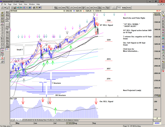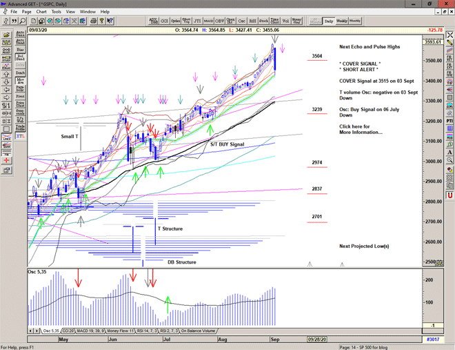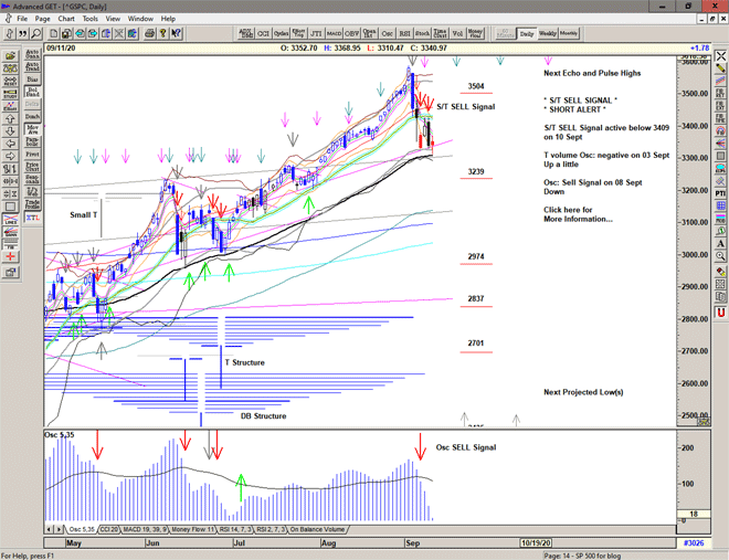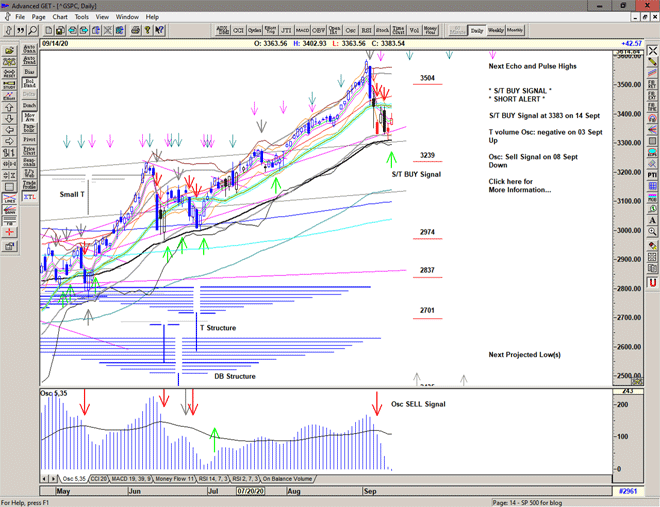 The market takes a dip before Labor day, triggering an S/T Sell Signal below 3418 and seeing a low of 3350 before a strong recovery cancels the Sell Signal for now.