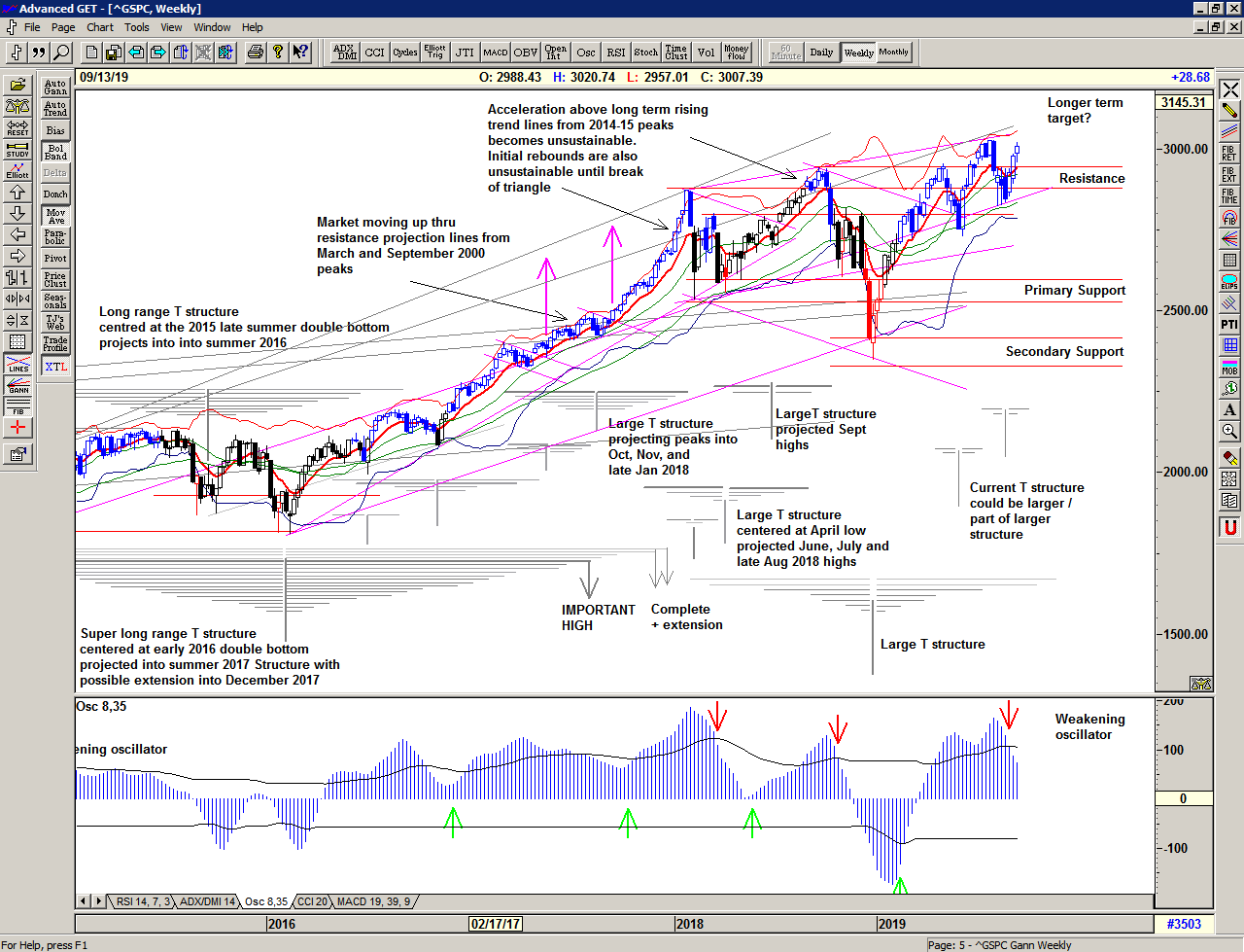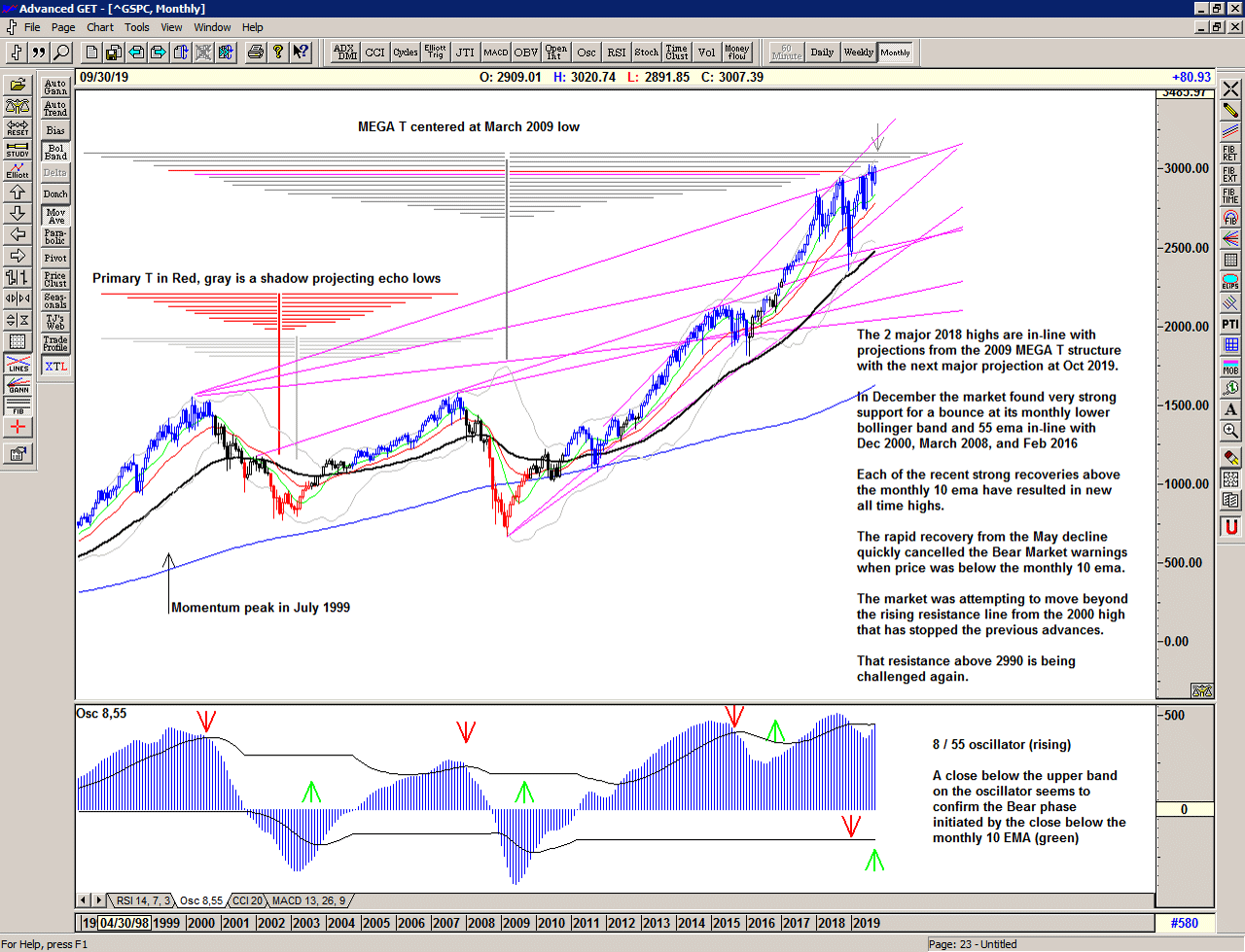 The Mega T structure projects another important high for October, and the oscillator remains strong supporting the possibility of new highs and perhaps ultimately a break out above that resistance line in due course.