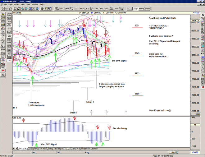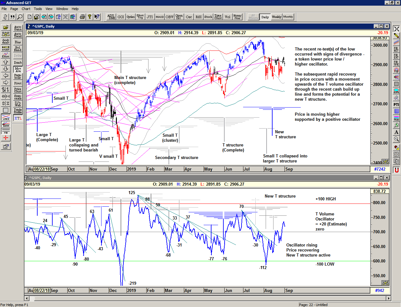 The Mega T structure projects another important high for October, and the oscillator remains strong supporting the possibility of new highs and perhaps ultimately a break out above that resistance line in due course.