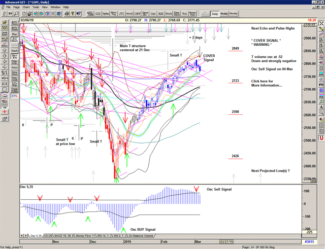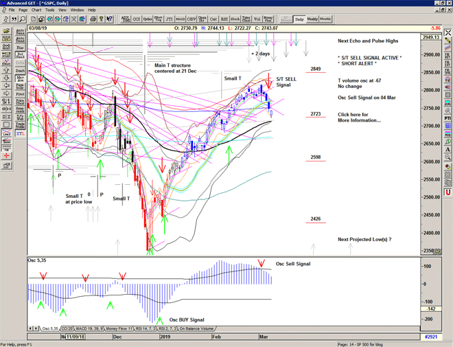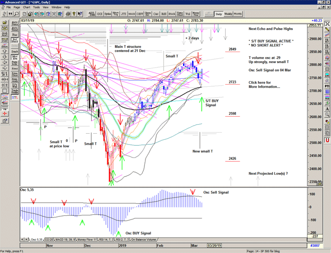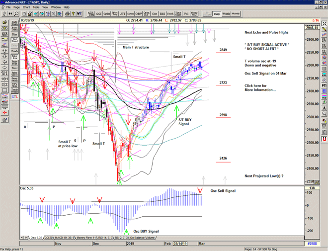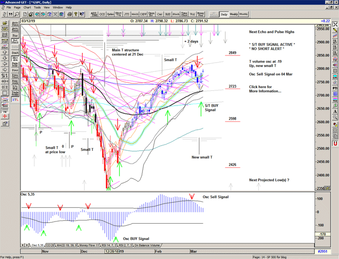 The T volume oscillator turns positive in support of the recent small T centered at last week's low, with upcoming projections for highs in late March that are also in-line with projections from the larger T structure centered at the December low.