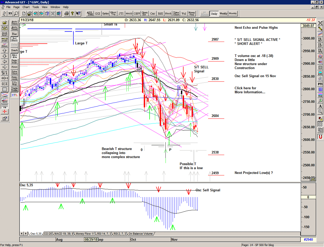 T volume oscillator back at zero (an inflection point) and the Osc oscillator makes a Sell Signal (admittedly a lagging indicator).
