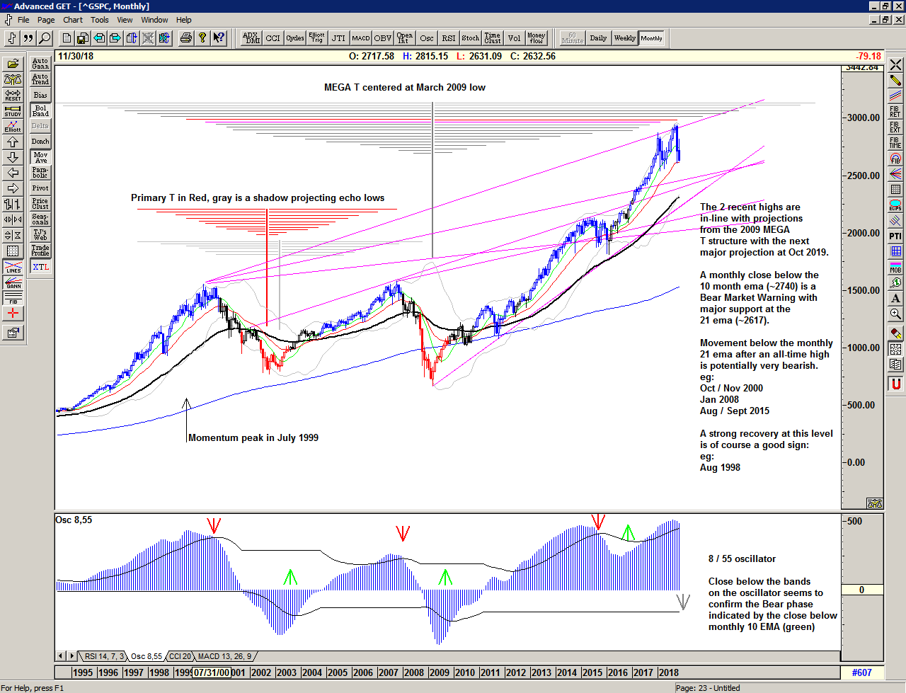 I have drawn each projection from the price highs prior to the major low. In the red T structure at the 2002 low we can see that the ultimate projection for the 2007 high came from the 1997 high which is of course much earlier than the final high in that bull market. Using the same logic we should keep an eye on the projections from the earlier highs. These are October 2019, August 2020, and January 2021.