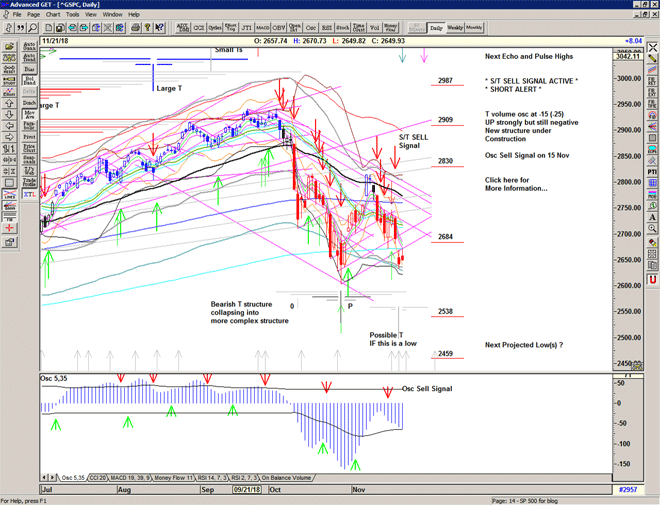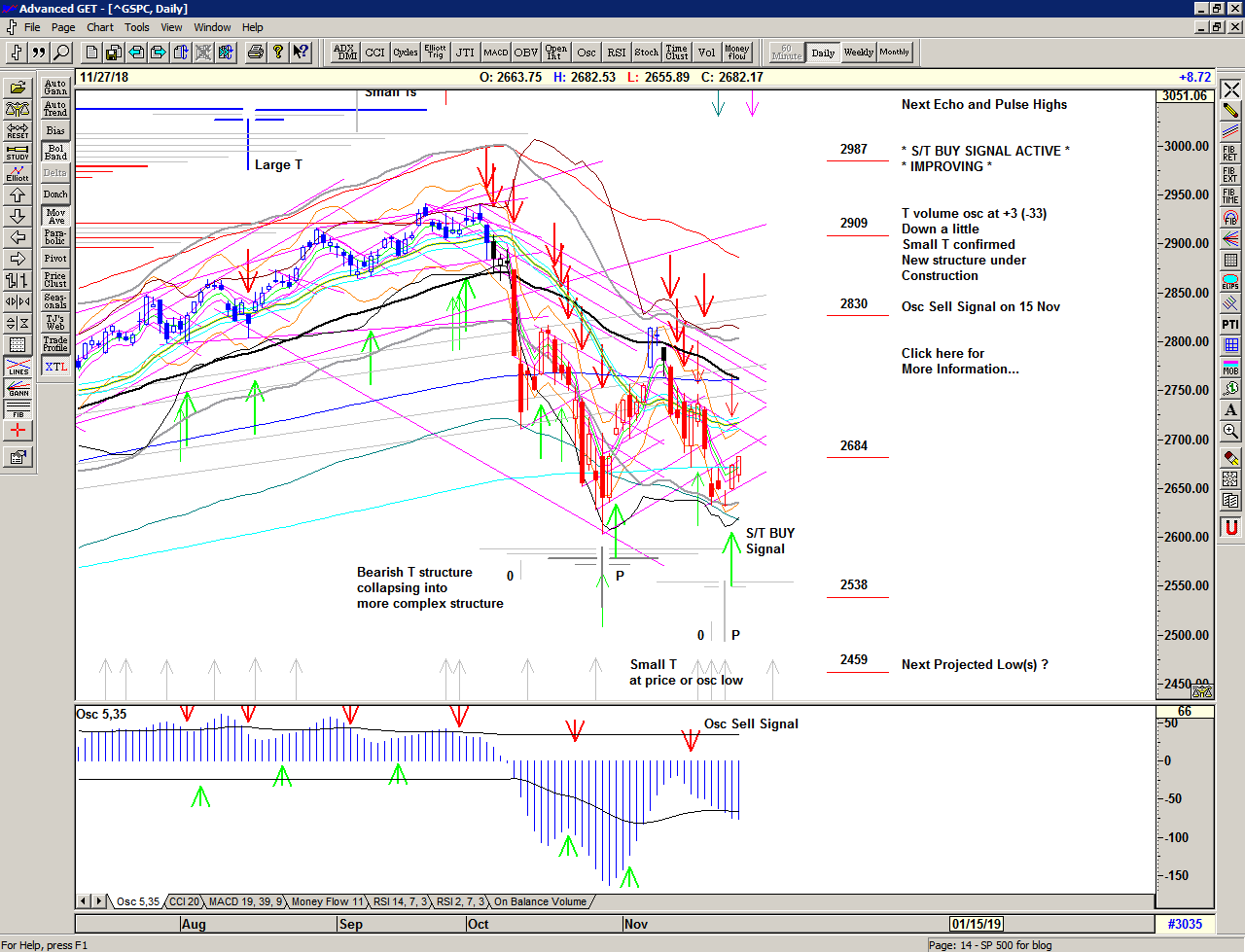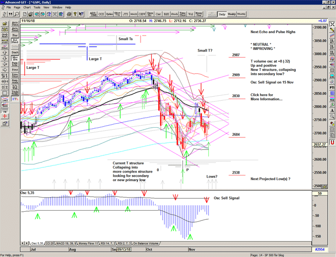 The strong rise off the October low had all the early signs of a potential V shaped T structure which projected a series of initial highs into 08 November, but at that point the rapid decline (in price and oscillator) started to flash some strong warning signs as the structure turned increasingly bearish.