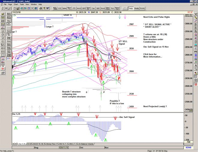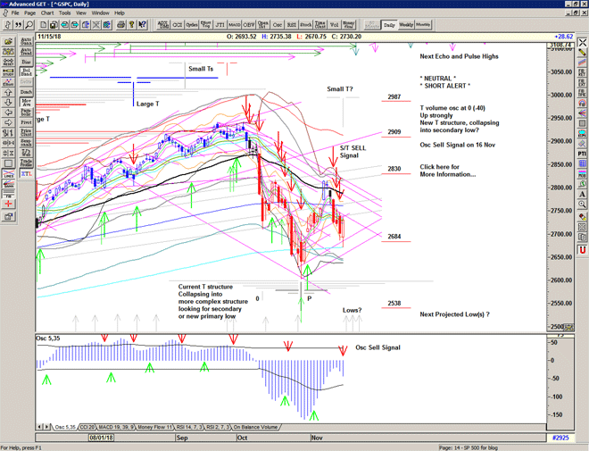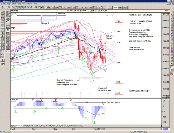 As we can see from the chart below with the T volume oscillator, the rise off the October low was indeed very strong with the oscillator making a new high. We can see the T confirmed by the oscillator moving upwards through the previous series of declining highs in the oscillator – the cash-build up line – and it should have projected highs on 08, 16, 23 November and 04 December. But the rapid decline in price and in the oscillator on 12 November hinted at a problem as the T structure collapsed and turned very bearish, providing fuel for the downside. We haven't seen this for some years.