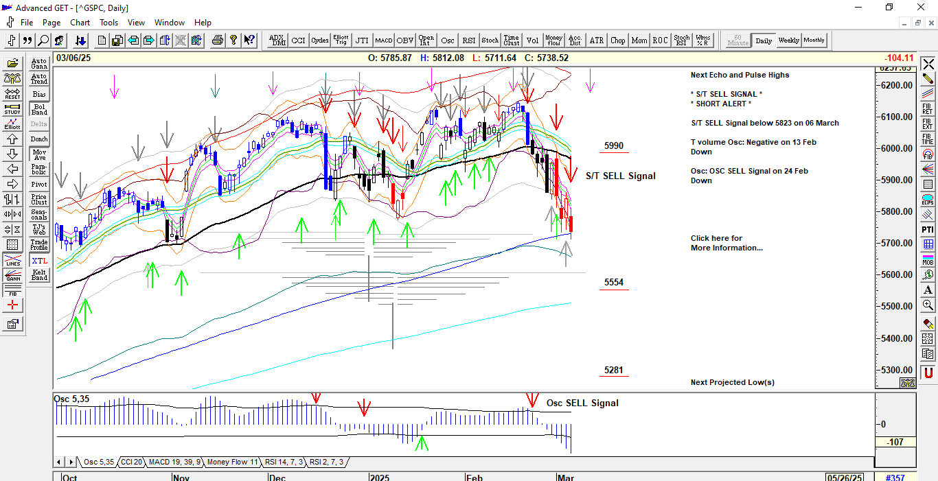 A huge drop below the Sell Signal line at 5823 making entry difficult and high risk in extremely erratic and volatile action.