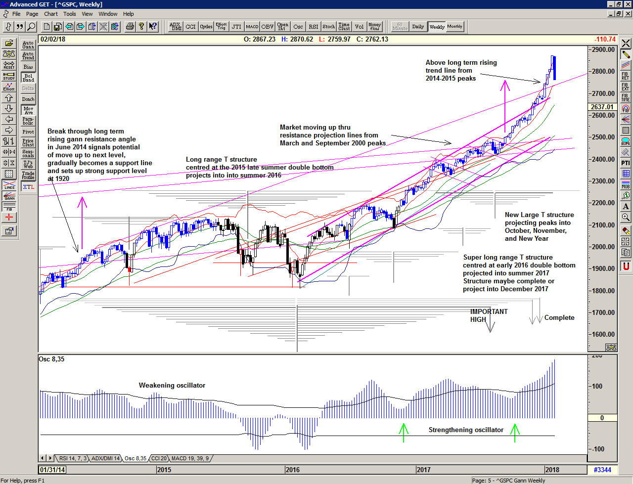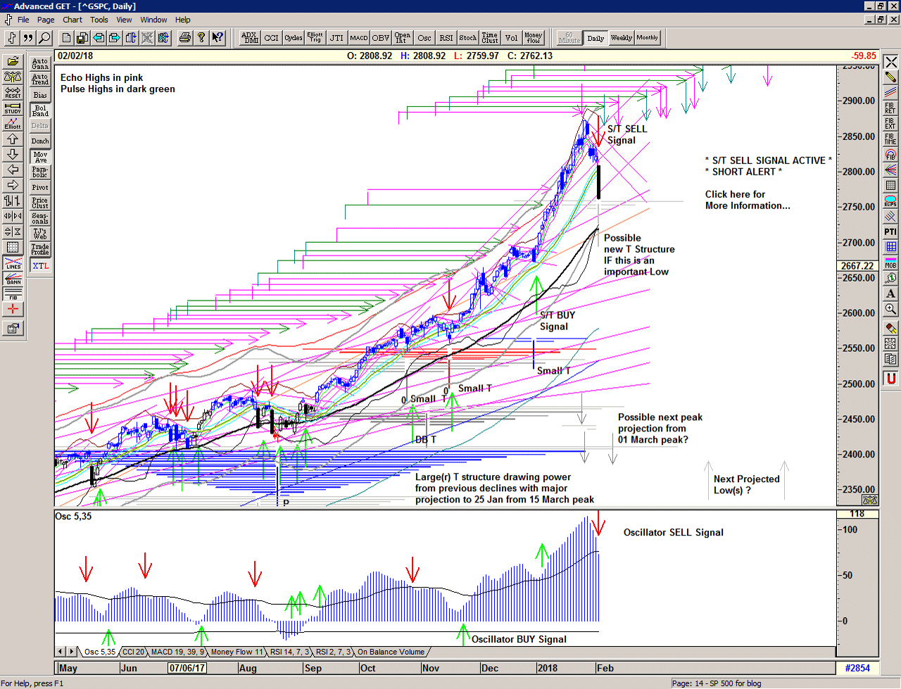 On Friday 26 January the market gapped higher and rallied to 2872 at (or just after) an important projection for a high from several of the structures, and one day after a scheduled echo high.