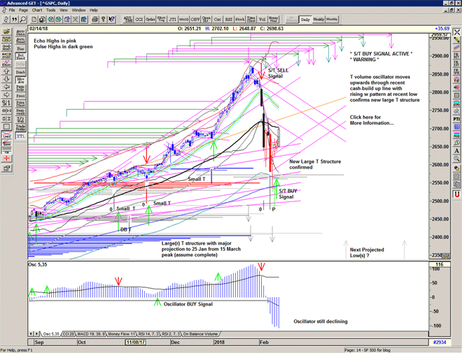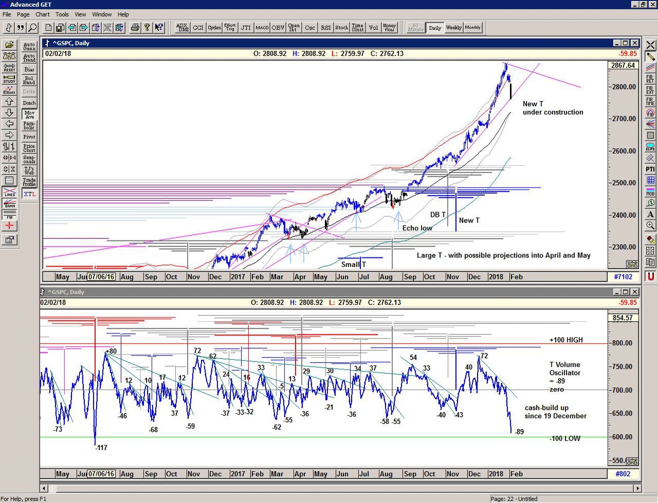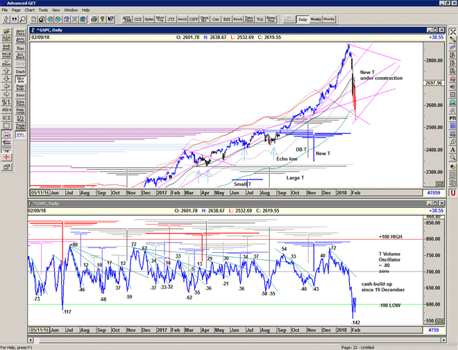 What we are looking for is for the oscillator to rise upwards and ultimately through the declining cash-build up line and this will then define the next T structure with the waves of selling from the oscillator high and from the various price highs, projecting the next series of highs in the market.