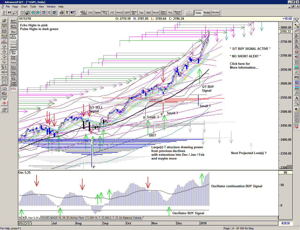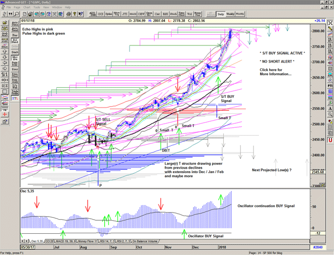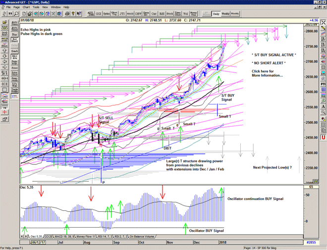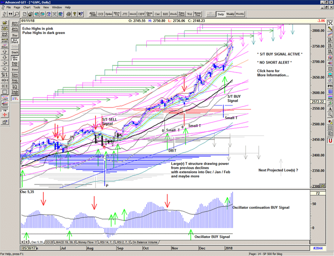 As we can see, on 02 January the market gapped up into another S/T Buy Signal at 2686 and took off, quickly erasing all of the indications that a correction or consolidation of any kind was imminent – which was of course the predominant thinking, including mine. This appears to have released an enormous amount of bullish energy as new all time highs beget further new all time highs.