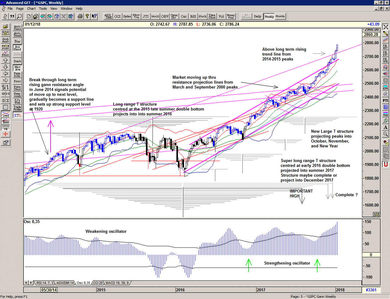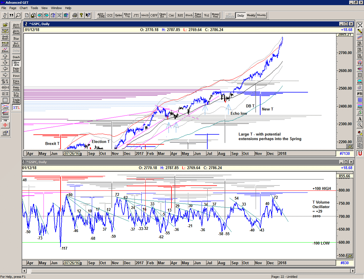 The T volume oscillator is strongly bullish and suggests that we take the longer projections of the 2 current structures very seriously indeed. That suggests to me that we should see further highs into February, March and April, perhaps even May, as projected by the full extent of the Large T structure (above).