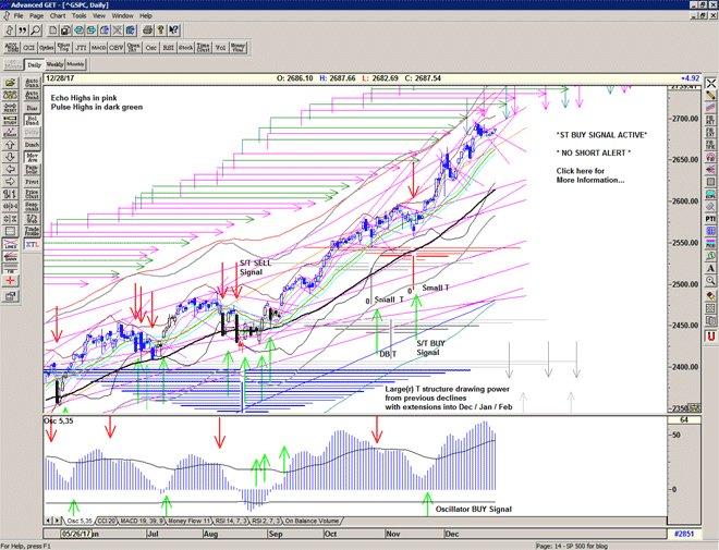 On the weekly chart we can see that the market has been rising towards the long term term rising trend line, and is nearly there. At the same time, we did have a possible completion of the Super long range T structure projected for early and late December – and that may well explain the additional volatility that came into the market in December.
