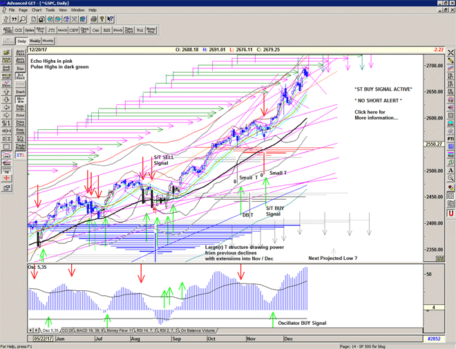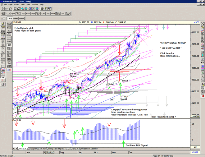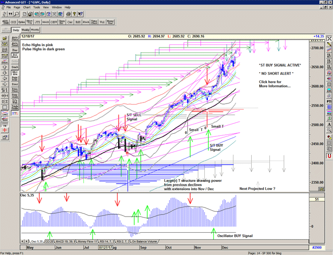 Only price action can help us determine which is correct, and the S/T signalling system is the only method that I have that will keep us on the right side of the market. As long as the market trades above the S/T Buy signal level we are (relatively) safe to continue Buying, if we close below that level we should protect our positions because the market is becoming (more) dangerous.