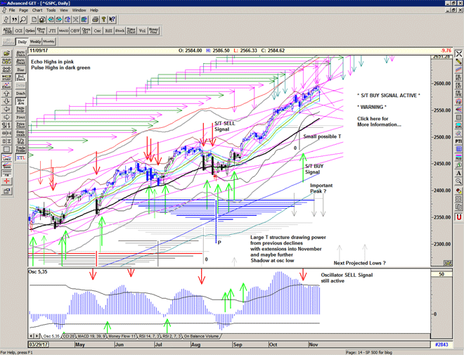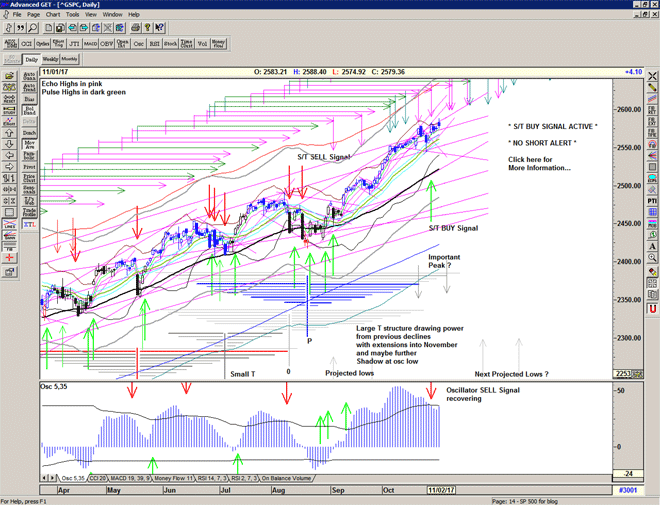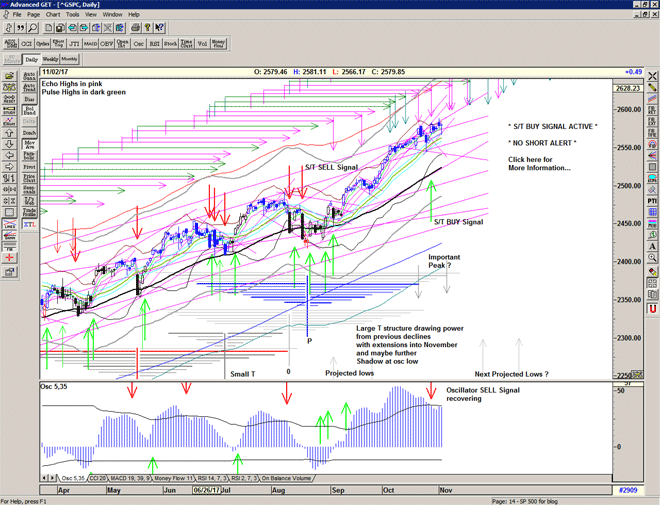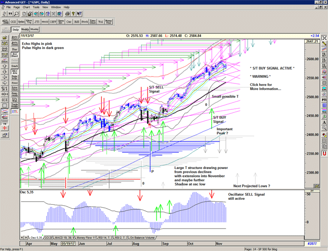 Because the T volume oscillator moved upwards to 54 through the longer cash-build-up line that goes back to the oscillator peaks in November and December 2016, we have the possibility of a much, much larger T structure that may extend into the New Year.