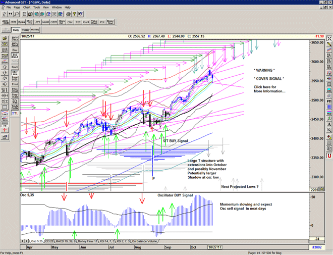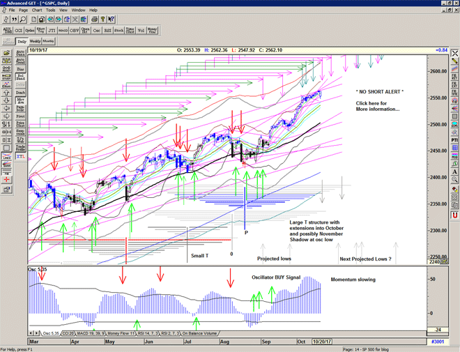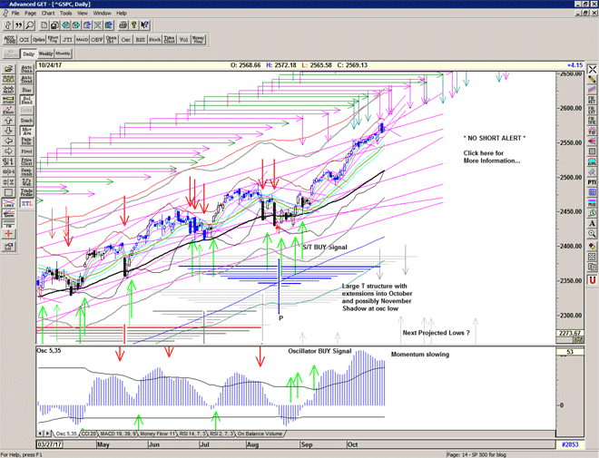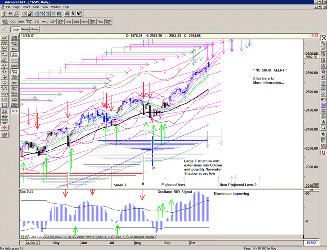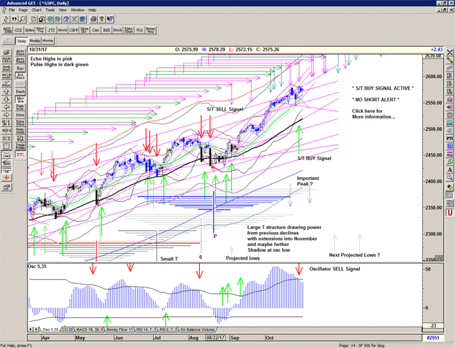 In the meantime the current active large T structure* that is centred at the August low continues to push the market higher in-line with expectations. The precision of the last 3 important projections and the renewed strength confirmed by the Buy signal supports the projections for further highs in due course.