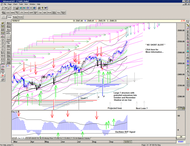 In my last report on 19 September the market was approaching an important test of strength. It had just traded above 2500 for the first time and was approaching an initial projection of the new T structure for a short term peak on 21 September. With the market showing significant strength it was a good time to ask the questions: Is there more? or will the round number target present a problem moving forward? I made the point that what happened after that projected peak would be very telling indeed, because the market was showing support for a much larger T structure and consequently significantly higher prices.