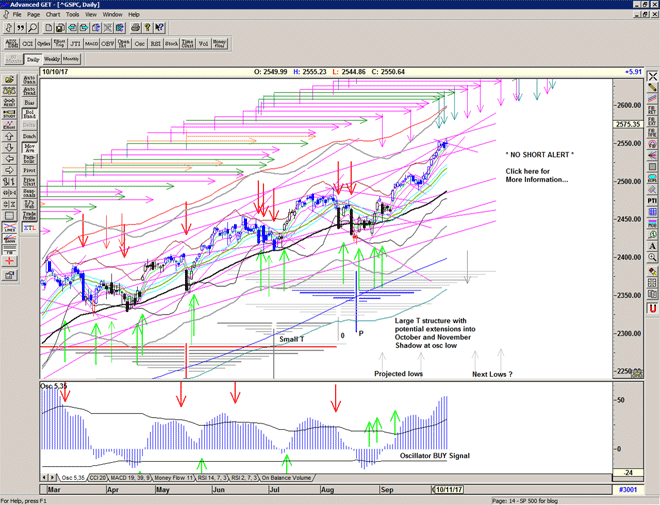 The market has rapidly moved higher with significant strength and has signalled that the current T structure is large – potentially drawing strength from each of the declines earlier this year. This is because the oscillator has moved upwards through the very long cash build up line going right back to the previous oscillator high at 72 on 15 november 2016. If you want an explanation for a melt up in stocks this is it.