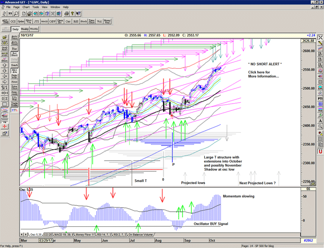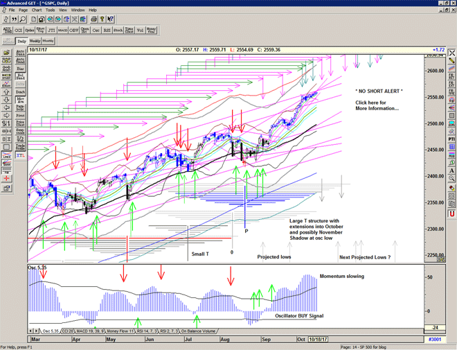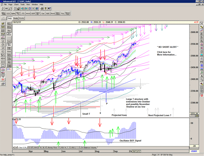 The super long range T structure now looks complete but with the possibility that it also projects into December. Each of the important declines that start above the final price low project subsequent peaks, and because the most recent projections had little or no effect it would seem that the new recent structure is now more dominant.
