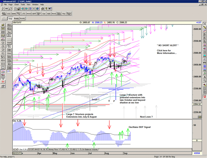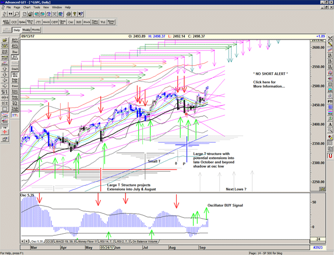 On the 22 August the market made a Short Term Buy Signal and defined a small T structure by cutting upwards through the descending cash-build up line of lower highs in the oscillator. After the initial hesitation related to the North Korean missile tests, another peak was produced on 1 September – slightly later than my original estimation for an important peak in the week of 25 August.
