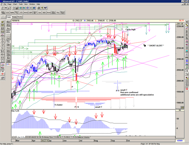 A Short Signal from 2151 occurring with the market dropping out of the recent triangle, and looking like its right on time with a cycle high scheduled for tomorrow, and the recent expiration of major arm of the red T structure.