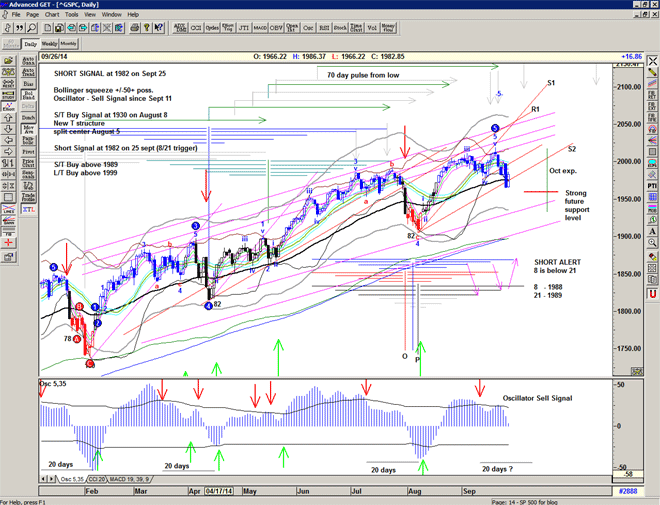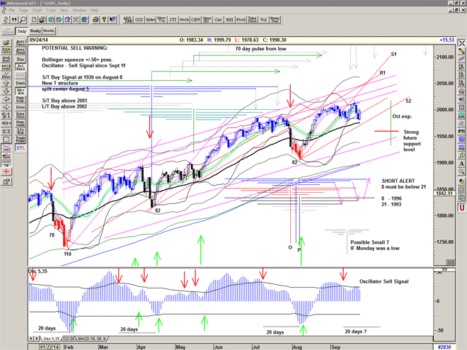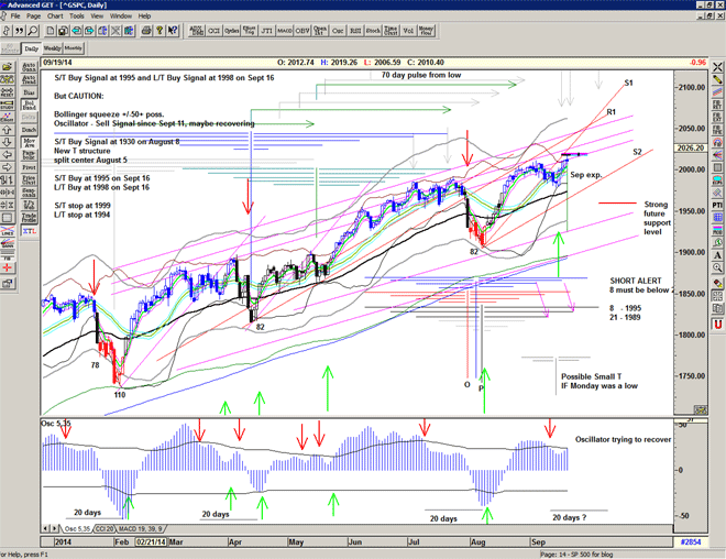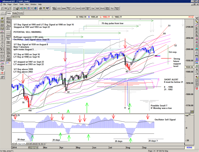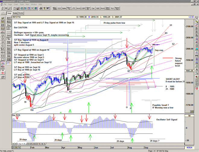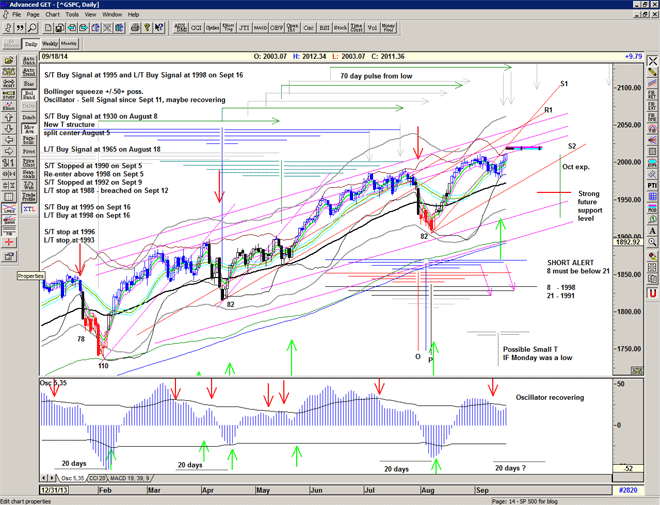 The Blue T structure certainly does seem to be working out, in which case expect to see a few days of weakness, perhaps a test of the 55 at about 1975 and S2 in the low 1970s.