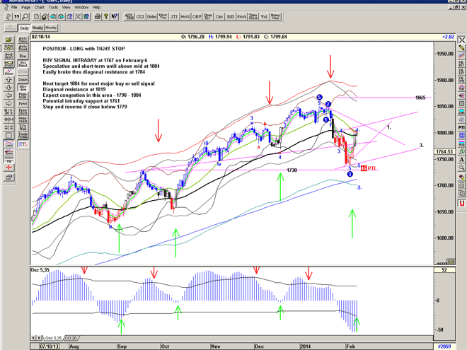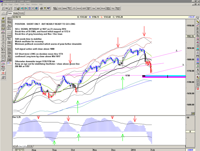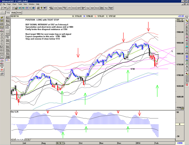Yesterdays decent rally of 21 points and close above 1767 confirms the expected short-term Buy signal. Notice the Sell-Buy-Sell action and 15 point spike-down on the 5th Feb leading to the move. Notice that gann line 3 is holding. And CCI confirms the move. A reversal is occurring if we see 1756 or lower intraday today or close below 1761. Note gann line 1. potential support.